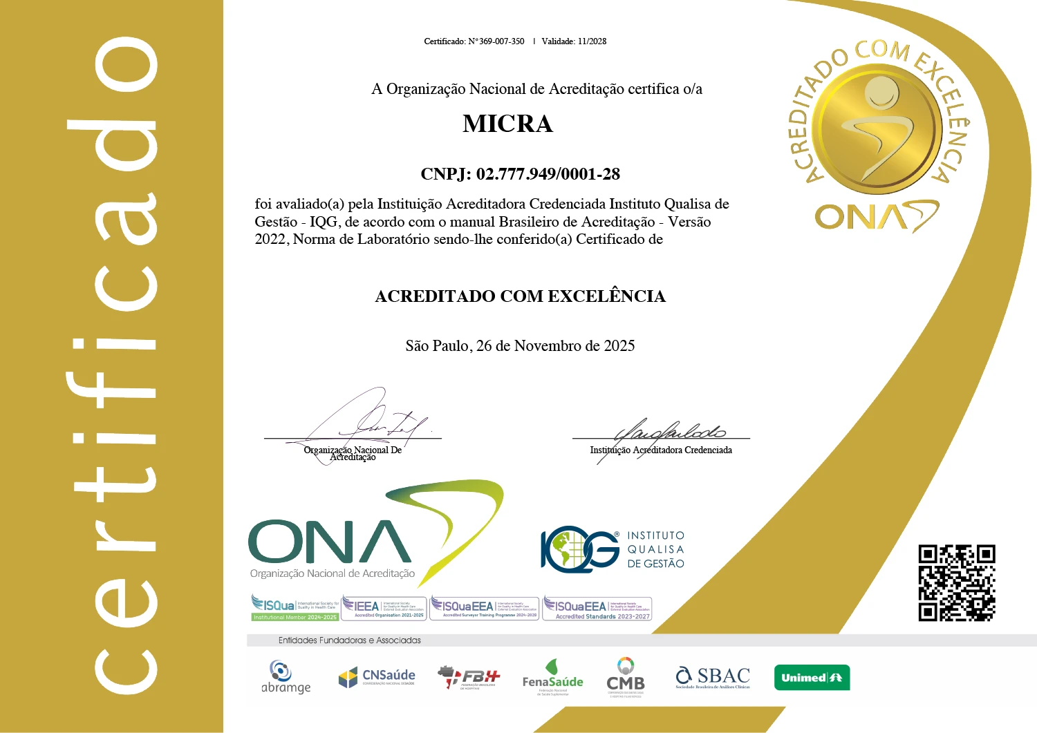 Laboratório Micra conquista o nível máximo de acreditação ONA: Acreditado com Excelência (Nível 3)